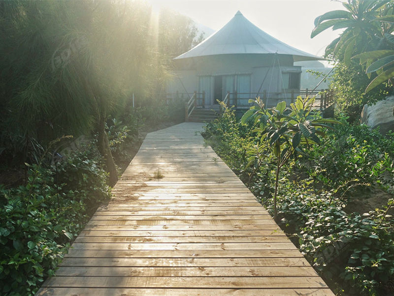 The material of glamping tent is PVC or PTFE tarpaulin. It is UV resistant and flame retardant and can resist temperatures from -30 to 70 degrees. It is acid and alkali resistant and can be disassembled and cleaned to ensure a clean and beautiful appearance. strong and sturdy.
